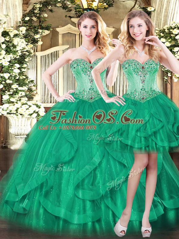 Comfortable Sleeveless Floor Length Beading and Ruffles Lace Up 15th Birthday Dress with Green