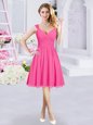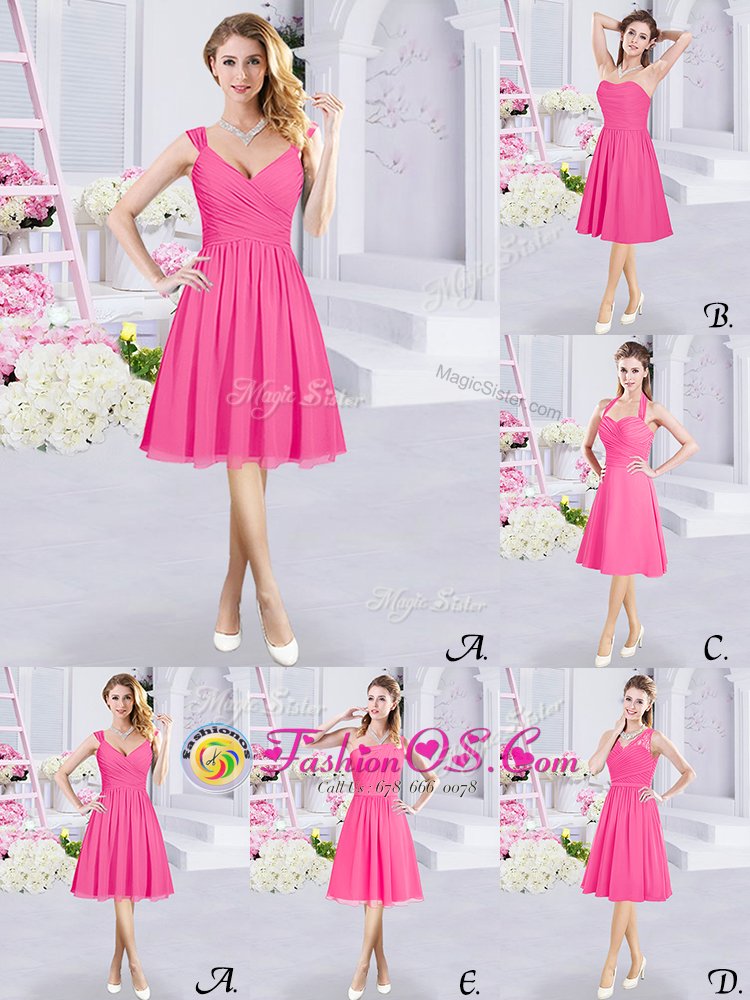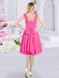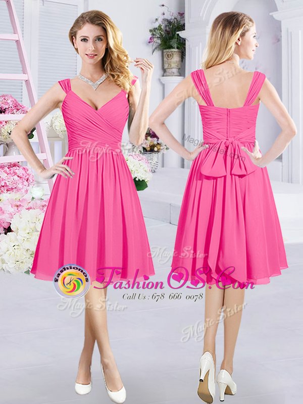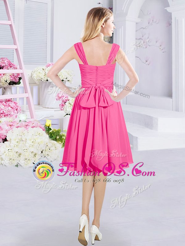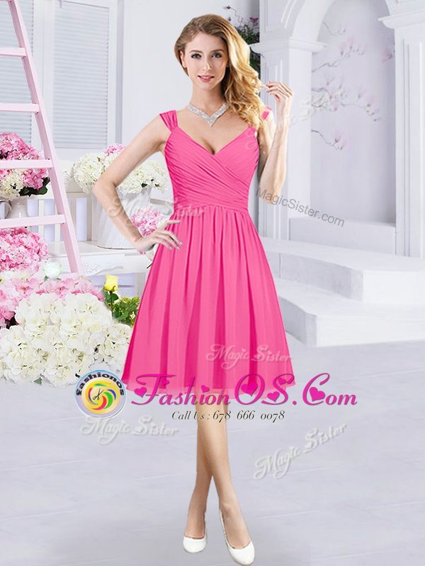 Comfortable Straps Sleeveless Quinceanera Court of Honor Dress Knee Length Ruching and Belt Hot Pink Chiffon