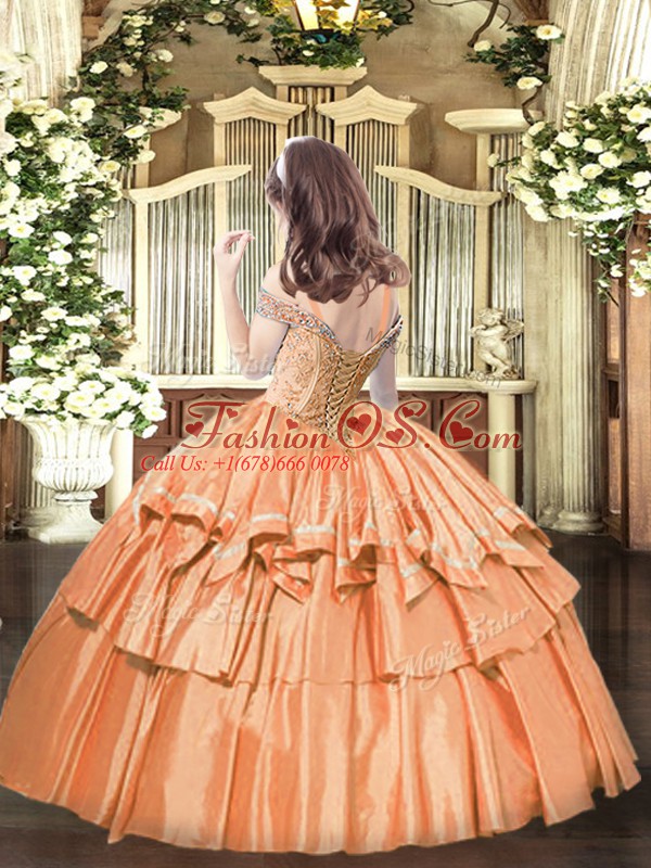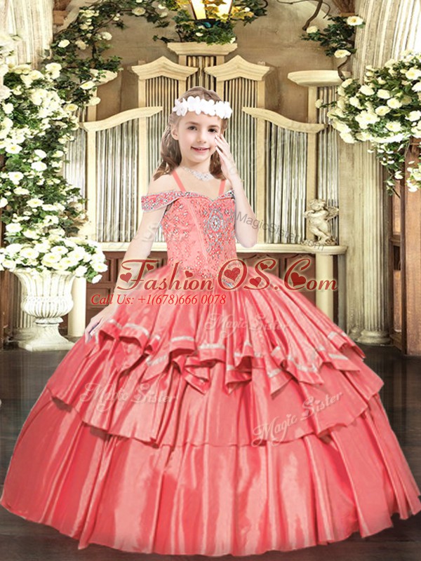 Home >  Special Occasion Dresses >  Beautiful Kids Pageant Dresses > Coral Red Ball Gowns Organza Off The Shoulder Sleeveless Beading and Ruffled Layers Floor Length Lace Up Pageant Dresses