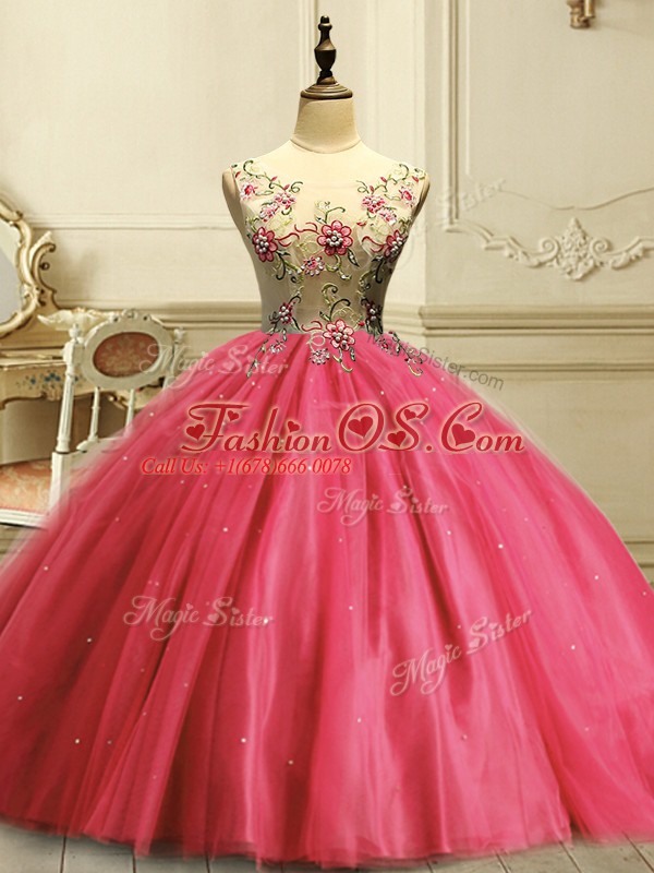 Coral Red Ball Gowns Scoop Sleeveless Tulle Floor Length Lace Up Appliques and Sequins Ball Gown Prom Dress