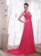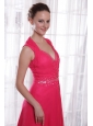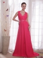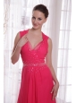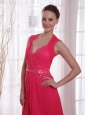 Home >  Prom Dresses >  Beautiful Prom Dresses > Coral Red Empire V-neck Brush /Sweep Beading Chiffon Prom/Party Dress