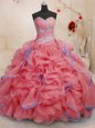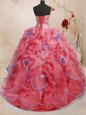 Coral Red Lace Up Sweetheart Beading and Ruffles Sweet 16 Quinceanera Dress Organza Sleeveless Brush Train