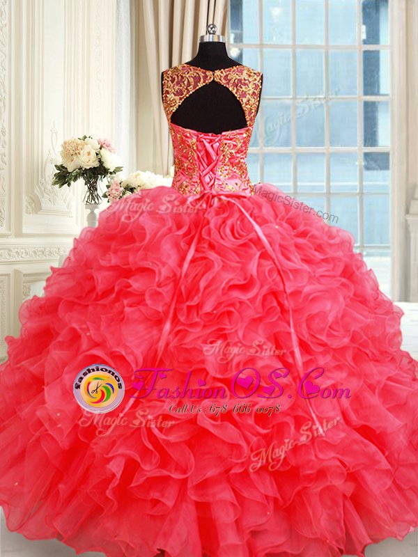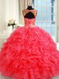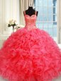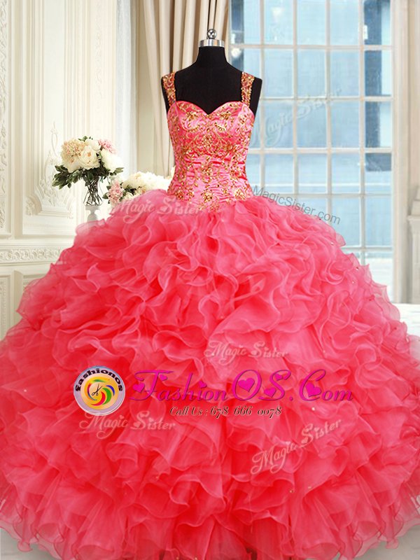 Coral Red Straps Lace Up Beading and Ruffles Sweet 16 Quinceanera Dress Sleeveless