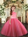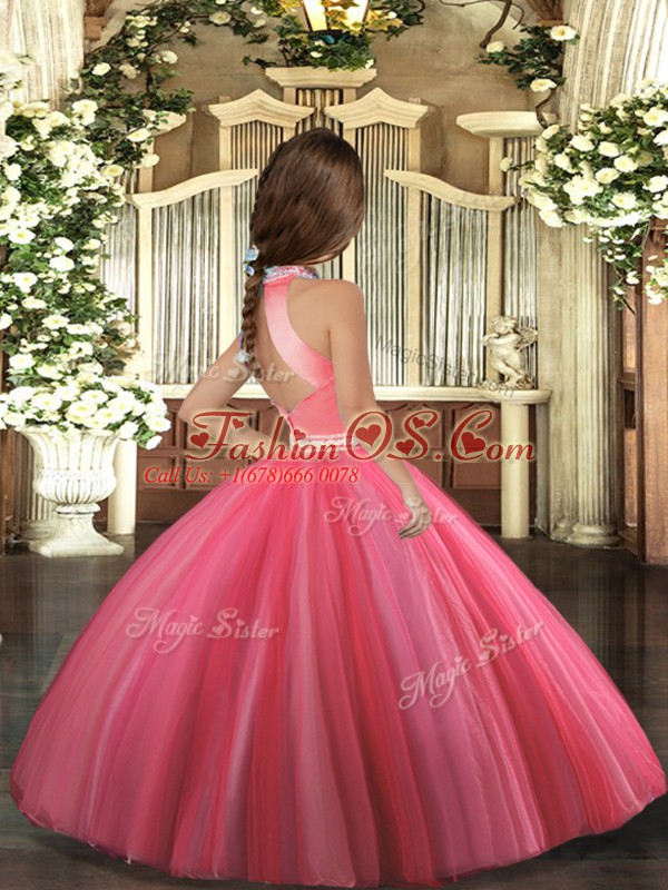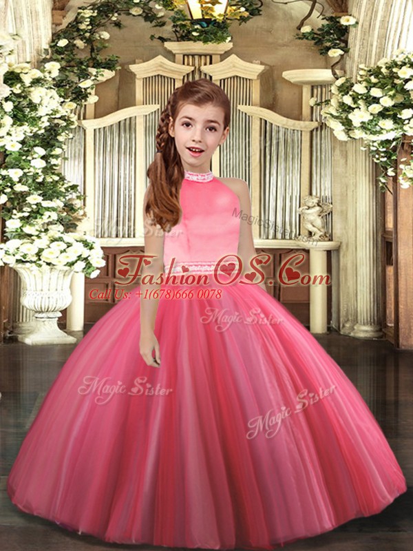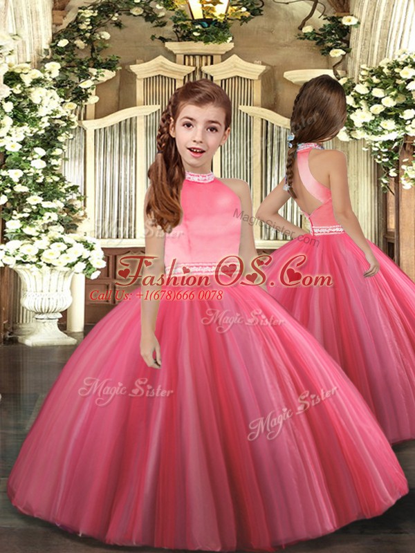 Coral Red Tulle Zipper High-neck Sleeveless Floor Length Kids Formal Wear Beading