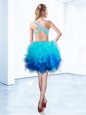 Custom Design Aqua Blue One Shoulder Neckline Beading and Ruffles Homecoming Dress Sleeveless Criss Cross