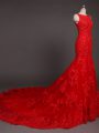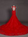 Custom Design Court Train Mermaid Evening Wear Red Scoop Lace Sleeveless Backless