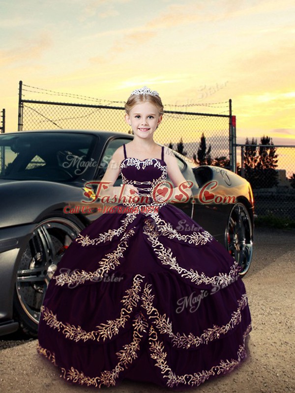 Home >  Special Occasion Dresses >  Beautiful Kids Pageant Dresses > Custom Design Dark Purple Lace Up Straps Embroidery Glitz Pageant Dress Satin Sleeveless
