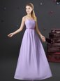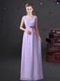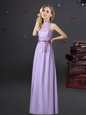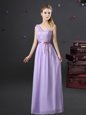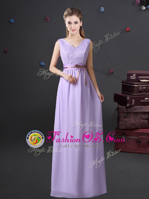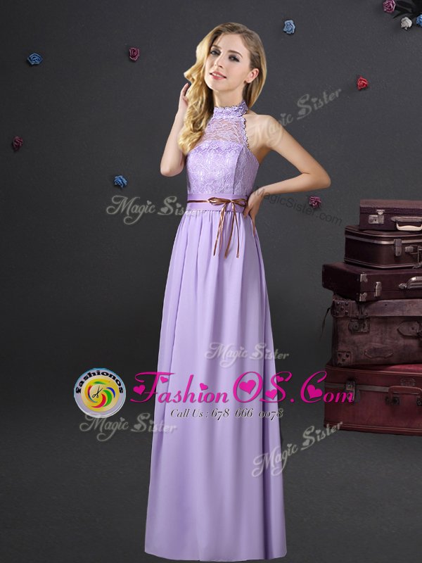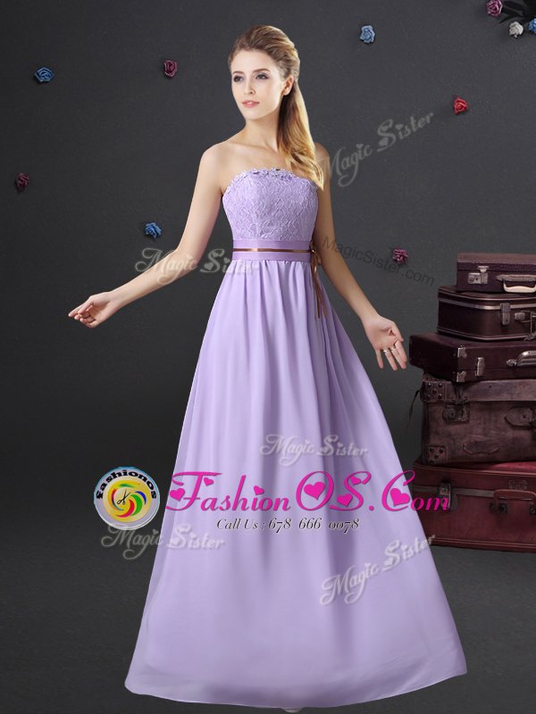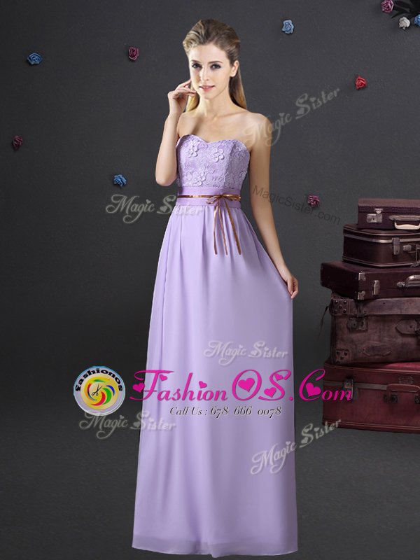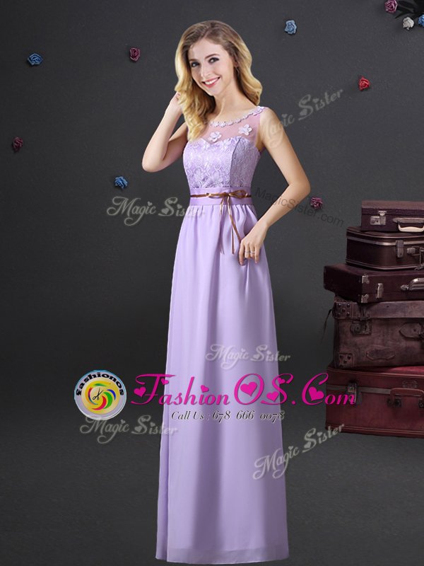Custom Design Lace and Appliques and Belt Bridesmaid Dress Lavender Lace Up Sleeveless Floor Length