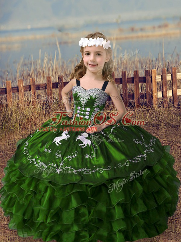 Custom Design Olive Green Sleeveless Embroidery and Ruffled Layers Floor Length Pageant Gowns For Girls
