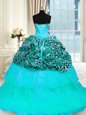Custom Design Ruffled Sweep Train Ball Gowns Sweet 16 Dresses Aqua Blue Strapless Organza and Printed Sleeveless Lace Up