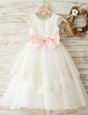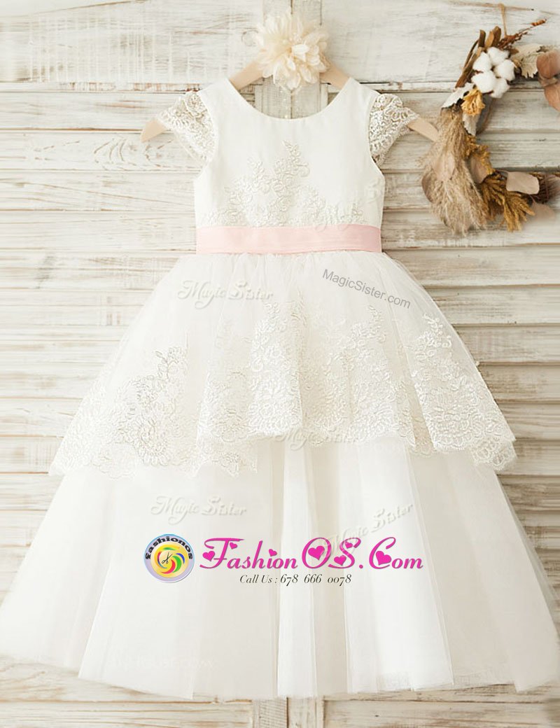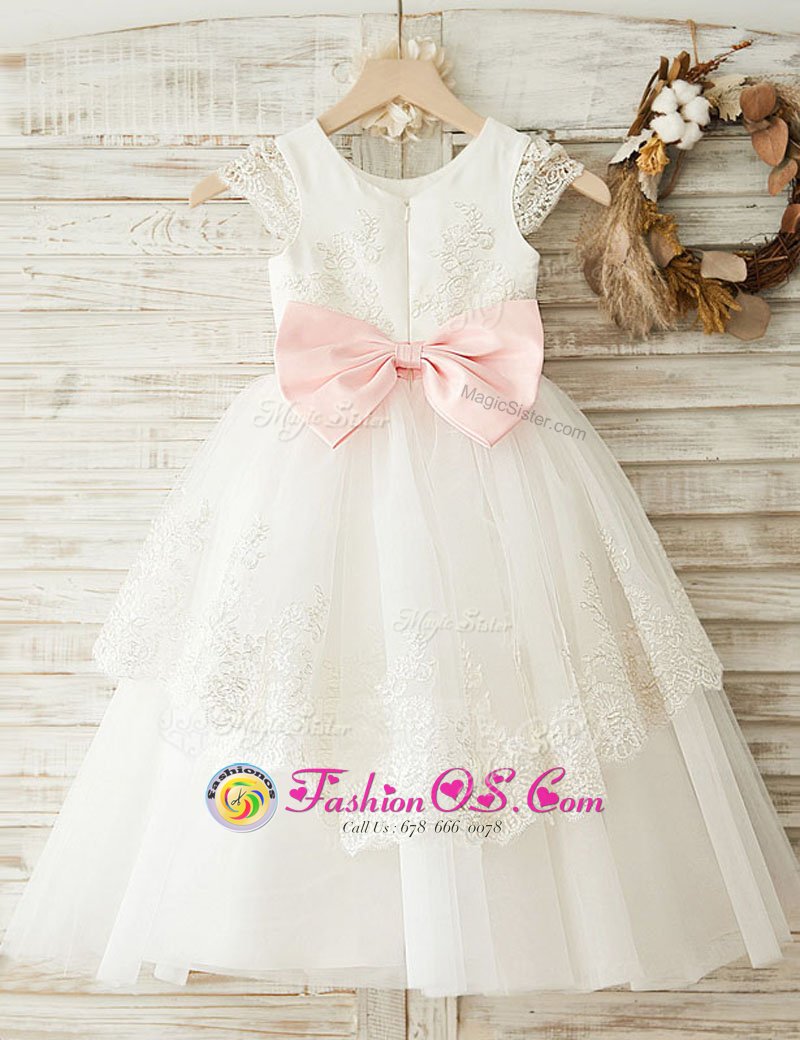 Custom Design White Organza Zipper Scoop Cap Sleeves Floor Length Flower Girl Dress Lace and Appliques and Bowknot