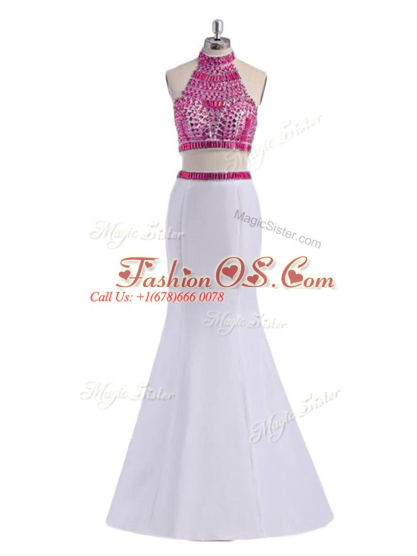Custom Design White Prom Evening Gown Prom and Party and Military Ball with Beading Halter Top Sleeveless Criss Cross