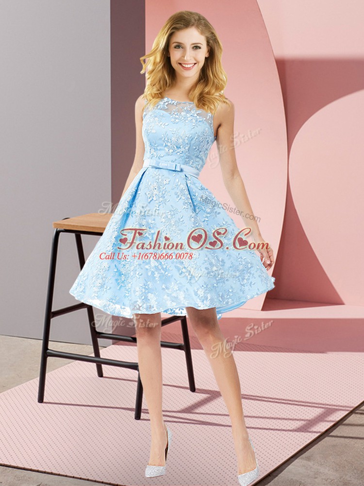 Custom Designed Aqua Blue A-line Scoop Sleeveless Lace Knee Length Zipper Bowknot Bridesmaid Dresses