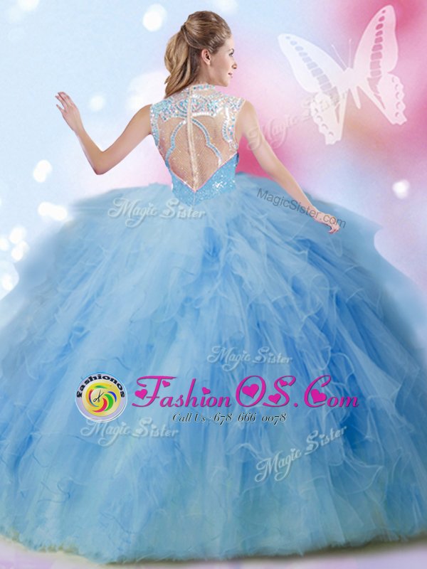 Custom Designed Blue Sleeveless Beading and Ruffles and Sequins Floor Length Sweet 16 Dress