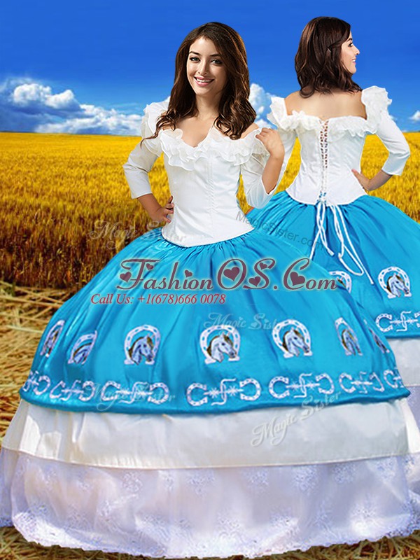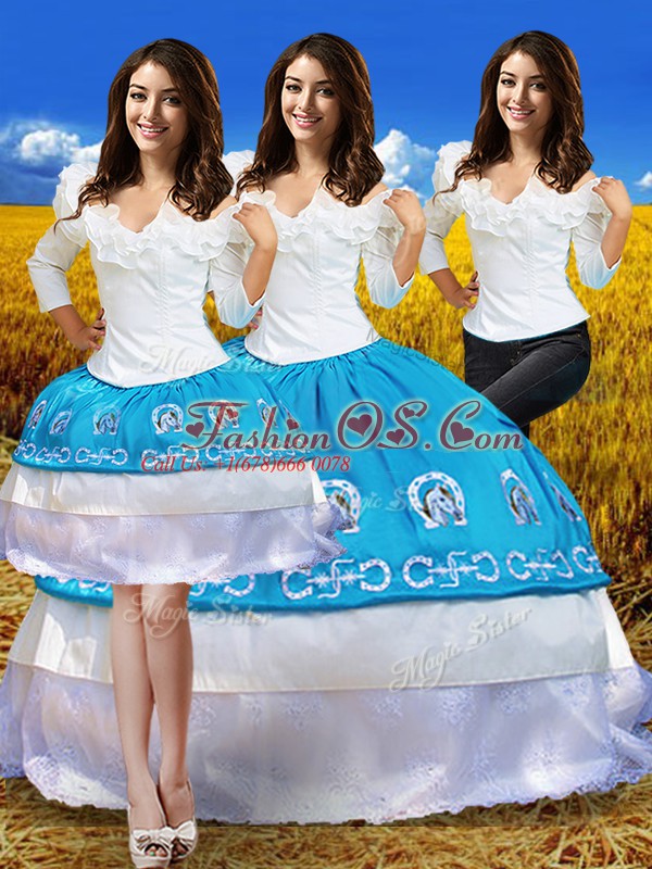 Custom Designed Floor Length Blue And White Sweet 16 Quinceanera Dress Taffeta 3 4 Length Sleeve Embroidery and Ruffles