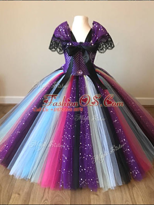 Custom Designed Floor Length Multi-color Little Girls Pageant Gowns Tulle Short Sleeves Sequins and Pattern