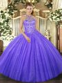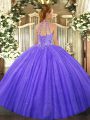 Custom Designed Lavender Ball Gowns Halter Top Sleeveless Tulle Floor Length Lace Up Beading and Embroidery Sweet 16 Dress