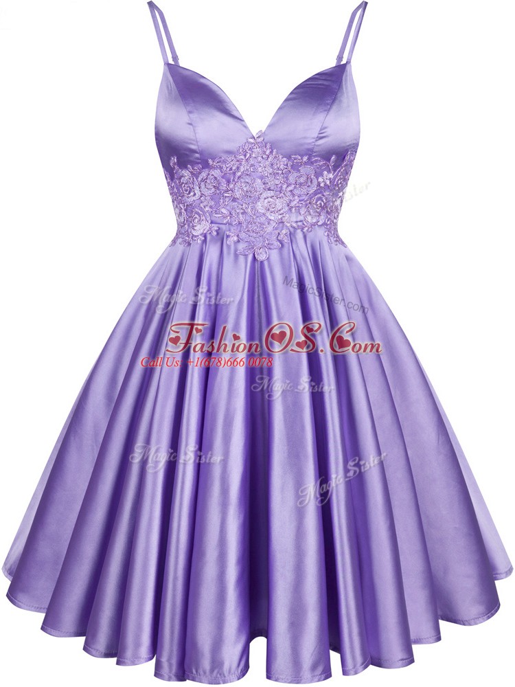 Custom Designed Lilac A-line Elastic Woven Satin Spaghetti Straps Sleeveless Lace Knee Length Lace Up Quinceanera Court Dresses