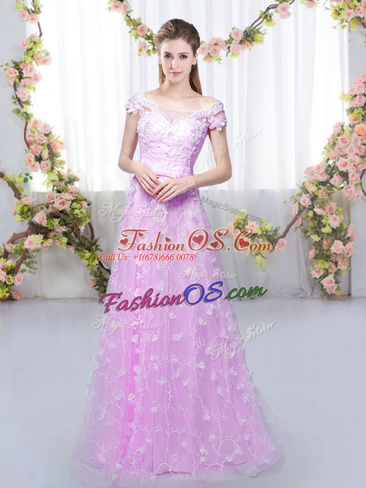 Custom Designed Lilac Cap Sleeves Floor Length Appliques Lace Up Bridesmaid Dresses