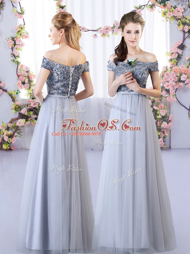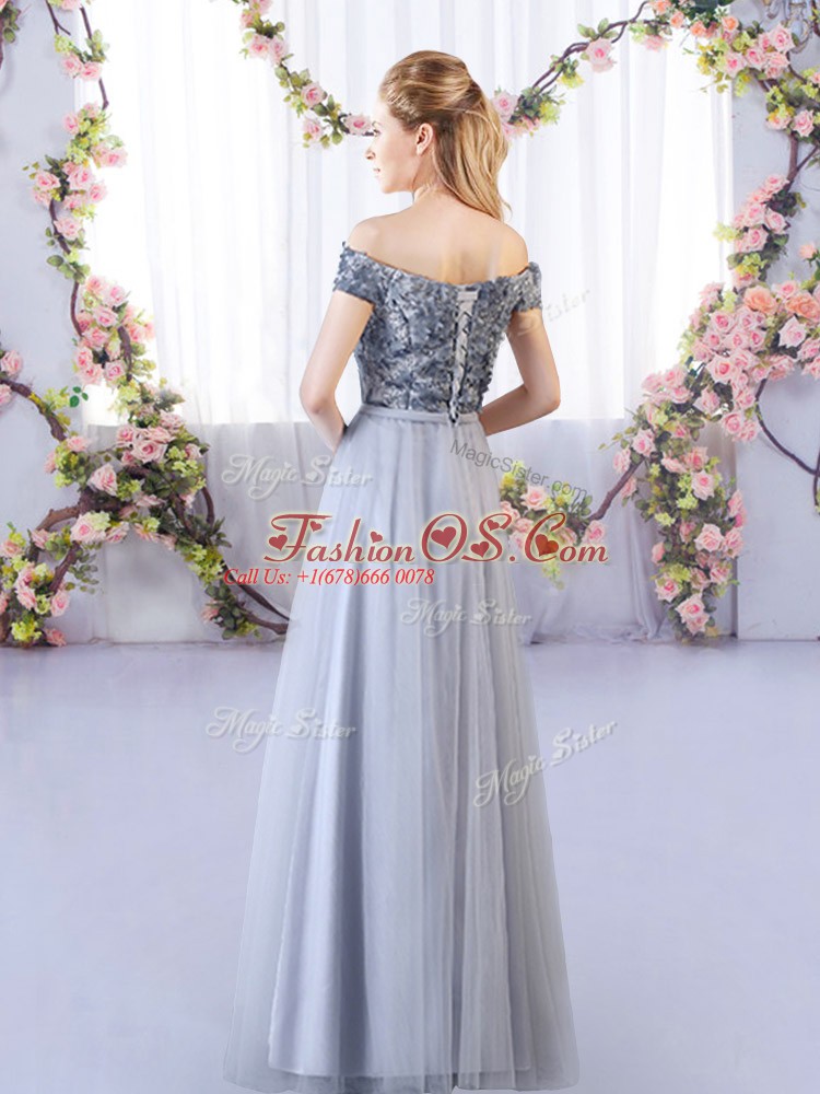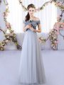 Custom Designed Off The Shoulder Sleeveless Vestidos de Damas Floor Length Appliques Grey Tulle