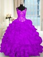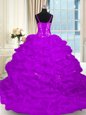 Custom Designed Organza Spaghetti Straps Sleeveless Brush Train Lace Up Beading and Embroidery and Ruffles Sweet 16 Quinceanera Dress in Purple
