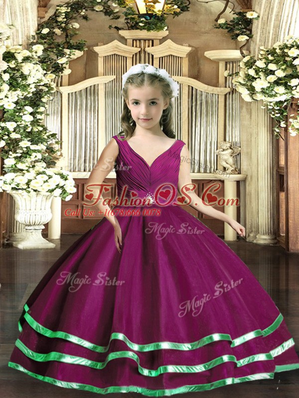 Home >  Special Occasion Dresses >  Beautiful Kids Pageant Dresses > Custom Designed Organza V-neck Sleeveless Backless Beading and Ruching Pageant Dress for Girls in Purple