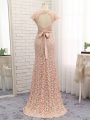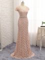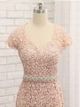 Custom Designed Peach Column/Sheath Beading and Belt Mother Of The Bride Dress Zipper Lace Cap Sleeves Floor Length