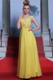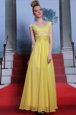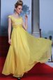 Custom Designed Pleated Floor Length Yellow Scalloped Short Sleeves Side Zipper