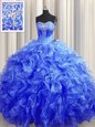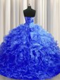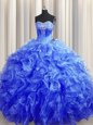 Home >  Quinceanera Dresses >  In Stock Quinceanera Dresses > Custom Designed Royal Blue Ball Gowns Sweetheart Sleeveless Organza Sweep Train Lace Up Beading and Ruffles Vestidos de Quinceanera