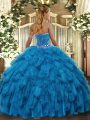 Custom Designed Royal Blue Strapless Lace Up Beading and Ruffles Quinceanera Gown Sleeveless