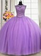 Custom Designed See Through Lavender Ball Gowns Beading and Appliques Sweet 16 Quinceanera Dress Lace Up Tulle Sleeveless Floor Length