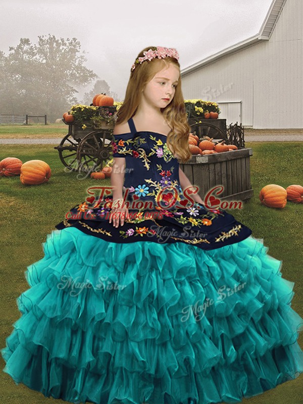 Custom Designed Teal Ball Gowns Embroidery and Ruffled Layers Kids Formal Wear Lace Up Organza Sleeveless Floor Length