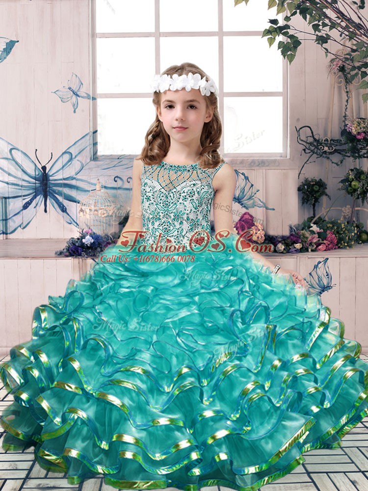 Custom Designed Teal Lace Up Scoop Beading and Ruffles Pageant Gowns For Girls Organza Sleeveless