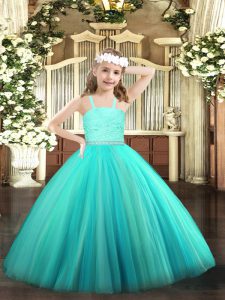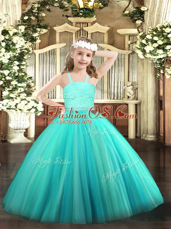 Custom Designed Turquoise Zipper Straps Beading and Lace Little Girl Pageant Gowns Tulle Sleeveless