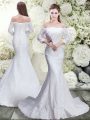 Custom Designed White Lace Up Wedding Gown Lace 3 4 Length Sleeve Brush Train