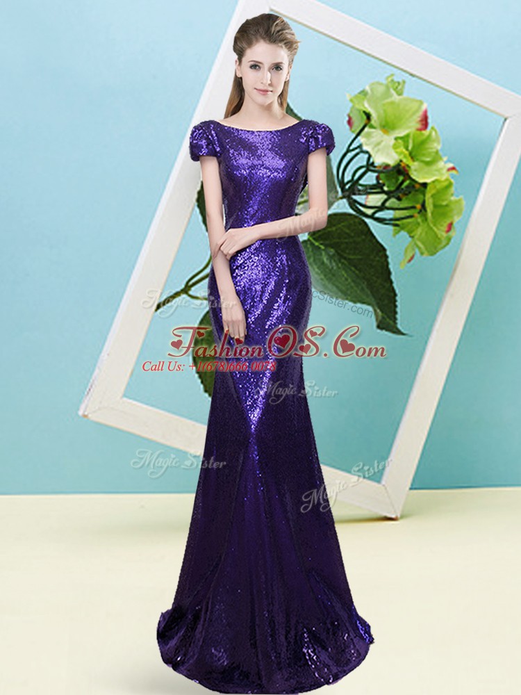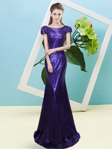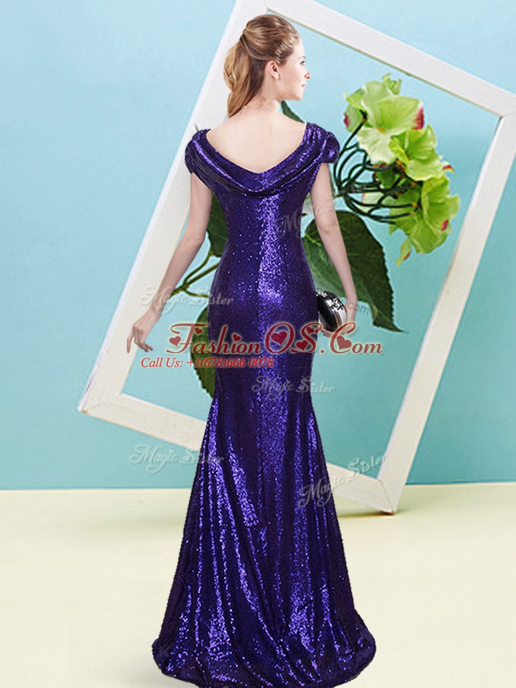 Custom Fit Cap Sleeves Floor Length Sequins Zipper Prom Dresses with Purple