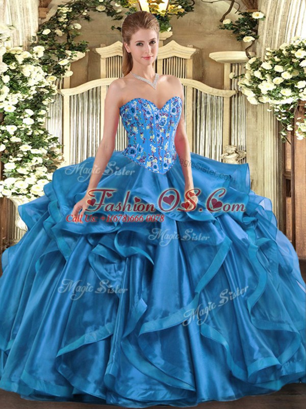 Custom Fit Floor Length Blue 15 Quinceanera Dress Organza Sleeveless Embroidery and Ruffles