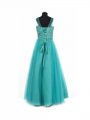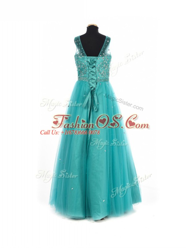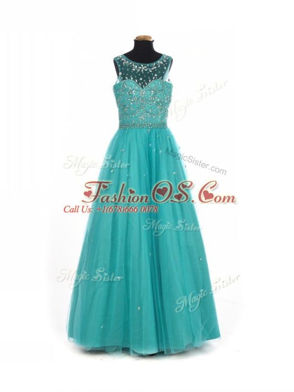 Custom Fit Floor Length Teal Kids Pageant Dress Scoop Sleeveless Lace Up
