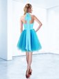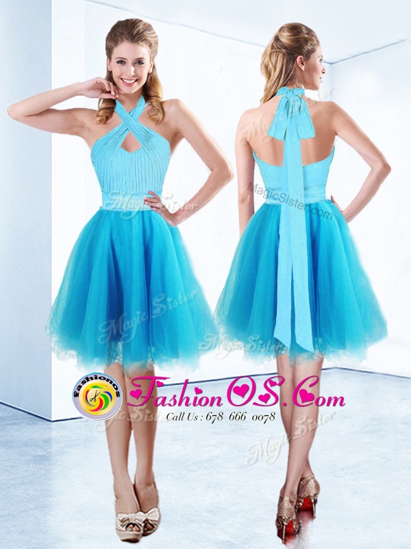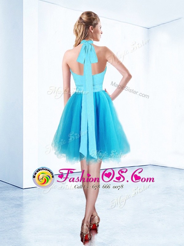 Custom Fit Halter Top Ruching and Belt Prom Dresses Aqua Blue Zipper Sleeveless Knee Length