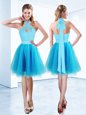Home >  Prom Dresses >  Fashionable Prom Dresses > Custom Fit Halter Top Ruching and Belt Prom Dresses Aqua Blue Zipper Sleeveless Knee Length