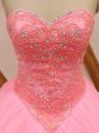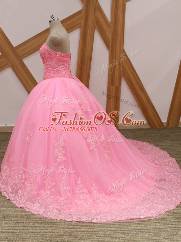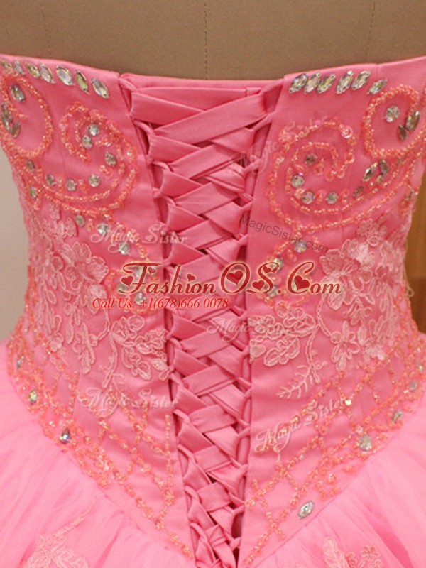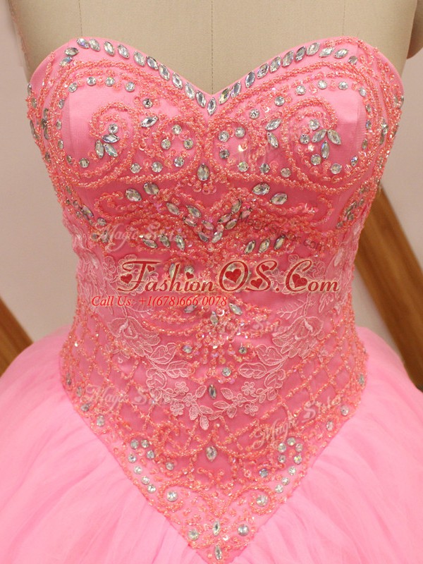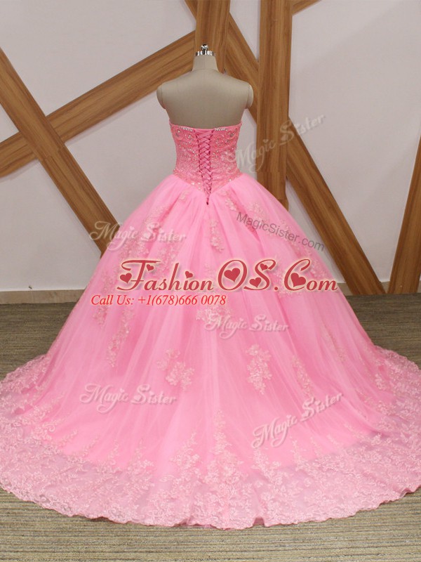 Custom Fit Lace Up Quince Ball Gowns Rose Pink for Military Ball and Sweet 16 and Quinceanera with Beading and Lace Brush Train
