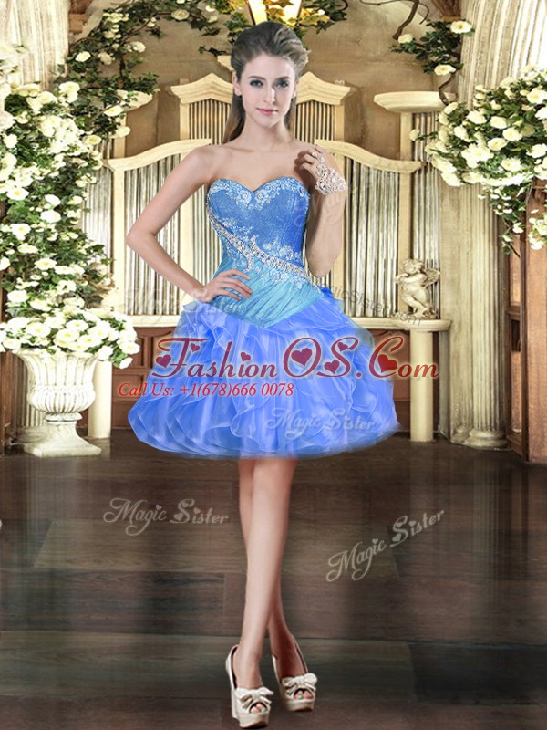 Custom Fit Mini Length Blue Prom Dresses Organza Sleeveless Beading and Ruffles