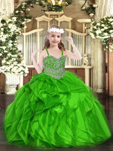 Custom Fit Organza Straps Sleeveless Lace Up Beading and Ruffles Pageant Gowns For Girls in Green
