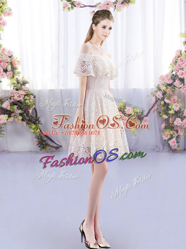 Custom Fit Short Sleeves Mini Length Lace Up Bridesmaids Dress in Champagne with Lace