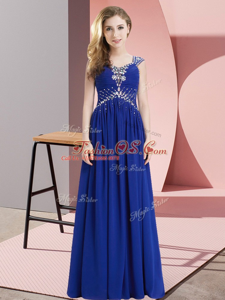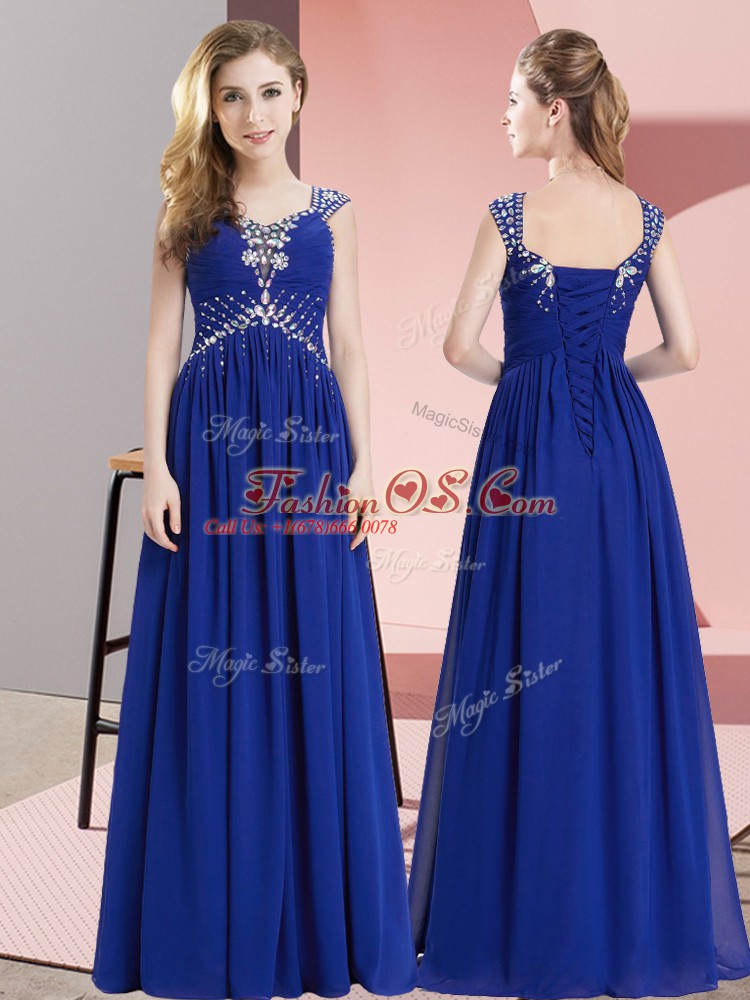 Custom Fit Sleeveless Chiffon Floor Length Lace Up Prom Evening Gown in Royal Blue with Beading