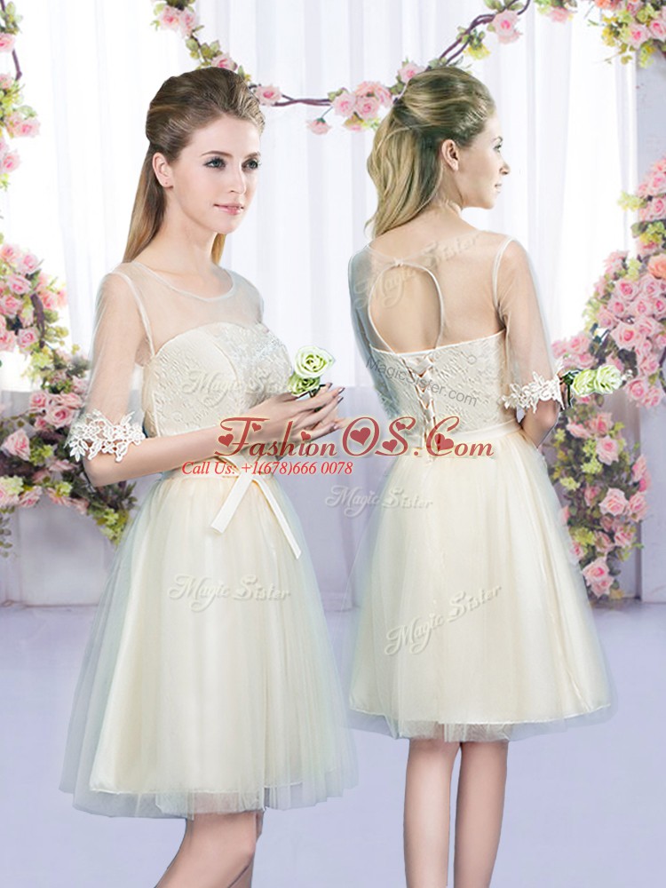 Custom Fit Sleeveless Mini Length Lace and Bowknot Lace Up Wedding Party Dress with Champagne