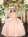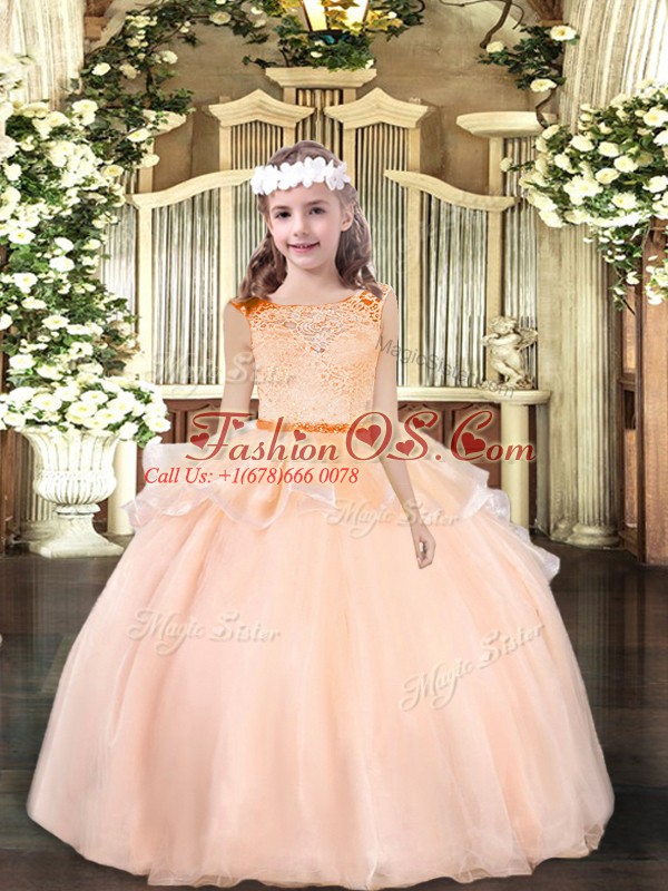 Custom Fit Sleeveless Organza Floor Length Zipper Little Girl Pageant Gowns in Peach with Lace