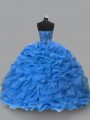 Custom Fit Sweetheart Sleeveless 15th Birthday Dress Floor Length Beading and Ruffles Blue Organza