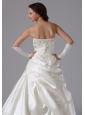 When you see this white wedding dress, you can't believe your eye, how amazing the creation! This creation features a beaded bust and a delicate embellishment that add some details to the dress. The A-line skirt with ruffles has floor length attached a court train that creats a dramatic effect. The trim of the corset style closure in the back secures the dress in place.