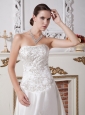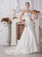 This A-line gown is everything that you've ever dreamed a wedding dress could be! It features an ruched strapless bodice and contrasting appliques through the bodice. The floor length skirt adorned with floral appliques with clean lines and folds with a brush train in the back. A zipper up style closure in the back secures the dress in place. The notable dress creates a touching effect which makes you the lightspot.